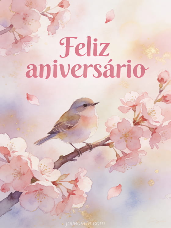 Envie um lindo feliz aniversário cheio de carinho. Um delicado passarinho em aquarela pousado num galho de cerejeira cria uma atmosfera poética de primavera. Descubra também um cartão de feliz aniversário a uma pessoa incrível ou feliz aniversário flores exóticas.