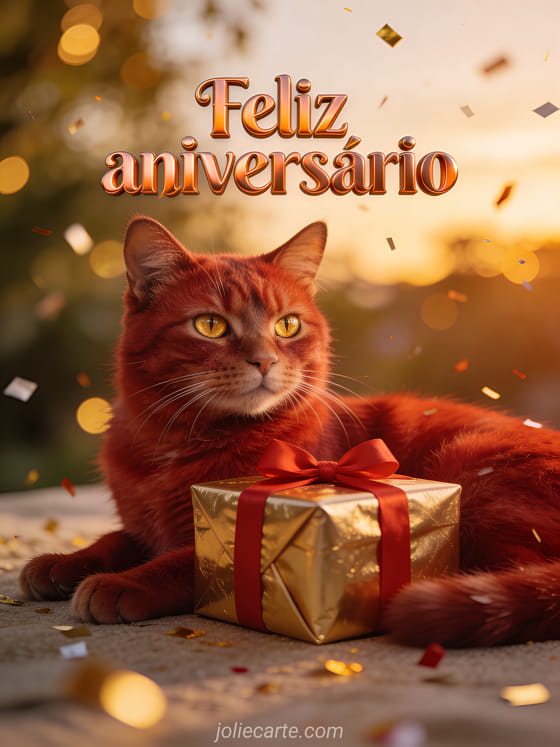 Compartilhe carinho com este cartão de aniversário com gato ruivo fotorrealista ao lado de um presente dourado e luz suave de fim de tarde. Você também pode ver feliz aniversário 365 dias de felicidade, feliz aniversário desenho colorido e feliz aniversário flores exóticas.