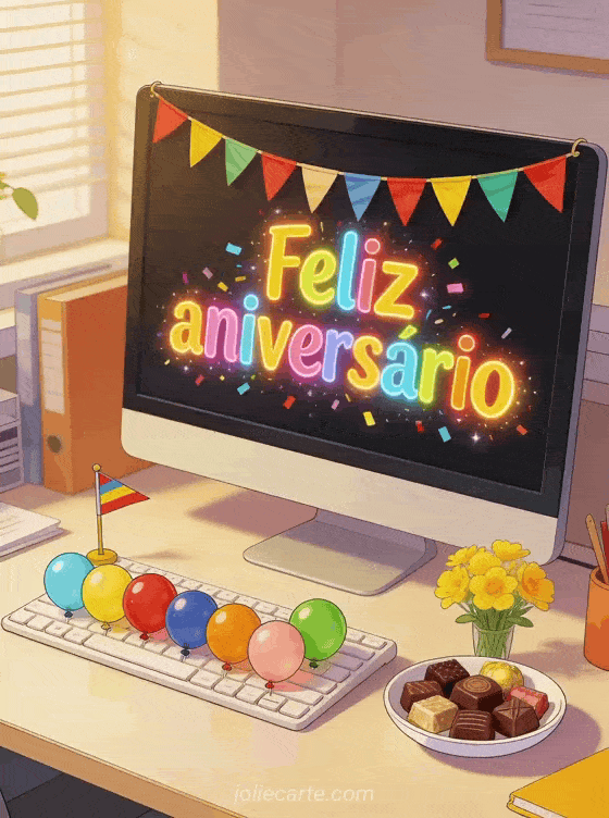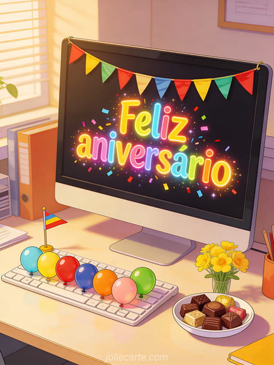 Compartilhe uma surpresa alegre de aniversário no escritório com letras coloridas, balões em miniatura, guirlanda, chocolates e flores amarelas. Você também pode enviar um feliz aniversário meu colega de trabalho, um feliz aniversário para minha colega de trabalho ou um feliz aniversário colega de trabalho.