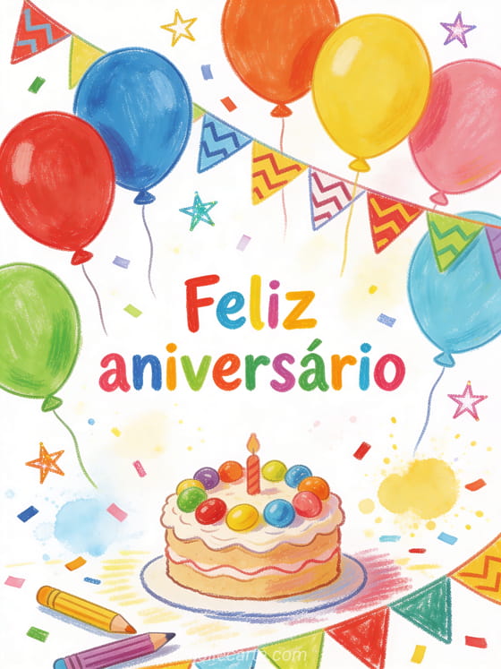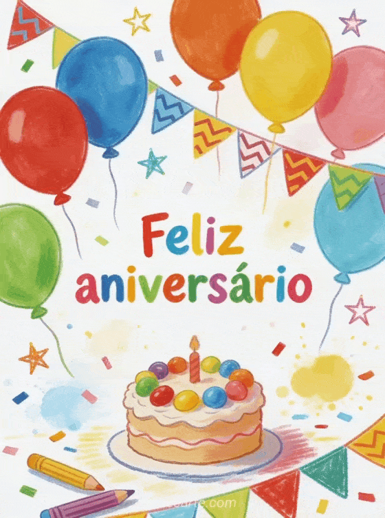 Deixe o dia mais feliz com este cartão de aniversário colorido com balões, bolo decorado, bandeirinhas, estrelas e confete. Você também pode ver feliz aniversário gato gif, cartão virtual feliz aniversário sapo e cartão feliz aniversário rosa.