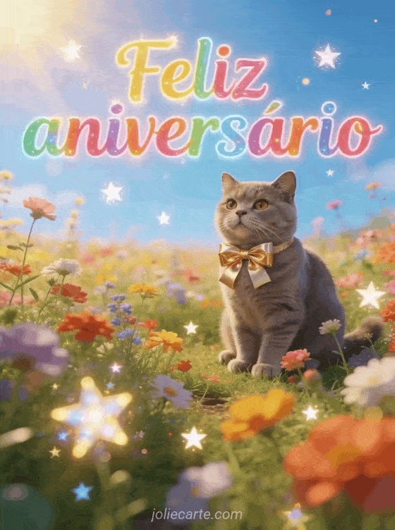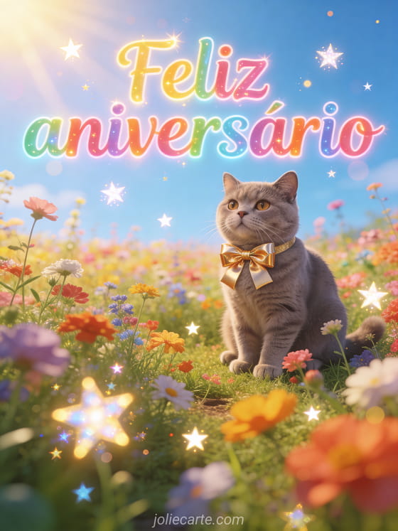 Compartilhe um cartão luminoso de aniversário com um adorável gato british shorthair cinza sentado entre flores silvestres coloridas, usando um laço dourado de presente sob um céu azul brilhante. Veja também um feliz aniversário meu filho gif animado, um cartão de aniversário para meu filho ou um feliz aniversário filho gif.