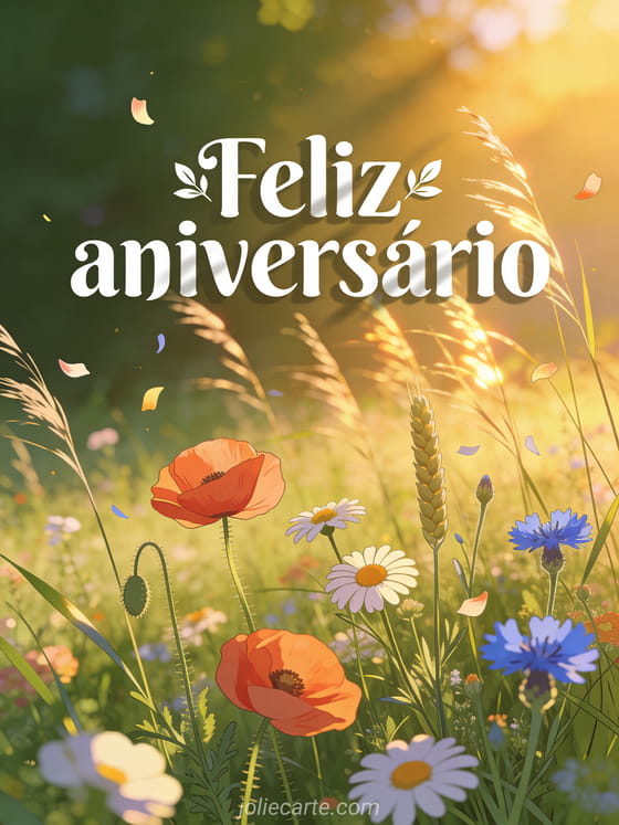 Comemore com um cartão de feliz aniversário flores natureza com papoulas, margaridas e charme campestre ao pôr do sol. Veja também feliz aniversário com máscara coronavírus, feliz aniversário cheio de felicidade e imagem feliz aniversário com flores.