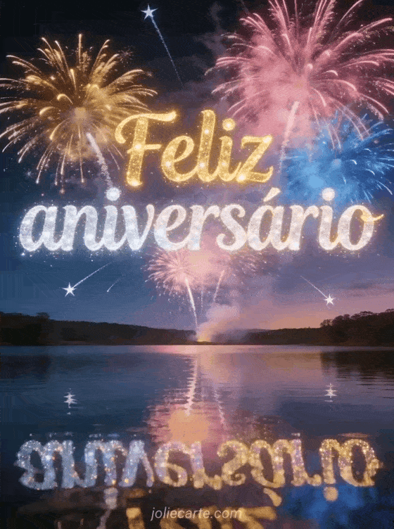 Celebre um aniversário com este impressionante cartão com letras douradas cintilantes, magníficos fogos de artifício multicoloridos explodindo sobre um lago tranquilo sob um céu estrelado. Descubra também um cartão de aniversário com letras douradas ou um cartão de aniversário com lontra.