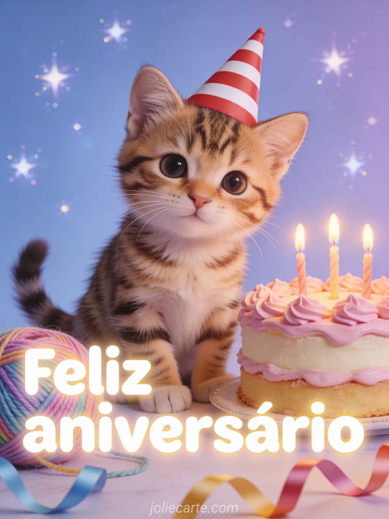 Celebre o aniversário de uma criança com este cartão doce com um adorável gatinho rajado. Descubra também um cartão aniversário unicórnio ou um cartão aniversário bebê.