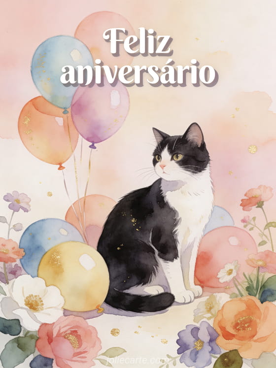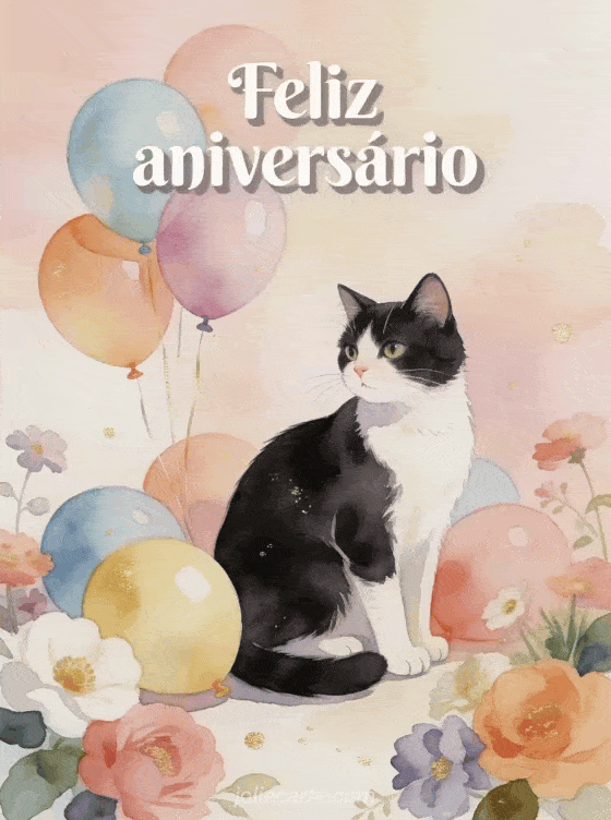 Compartilhe uma celebração suave com esta ilustração em aquarela de gato preto e branco, flores, tons pastel e balões coloridos. Você também pode ver feliz aniversário com gato ruivo, feliz aniversário 365 dias de felicidade e desejo a você um feliz aniversário cheio de alegria.