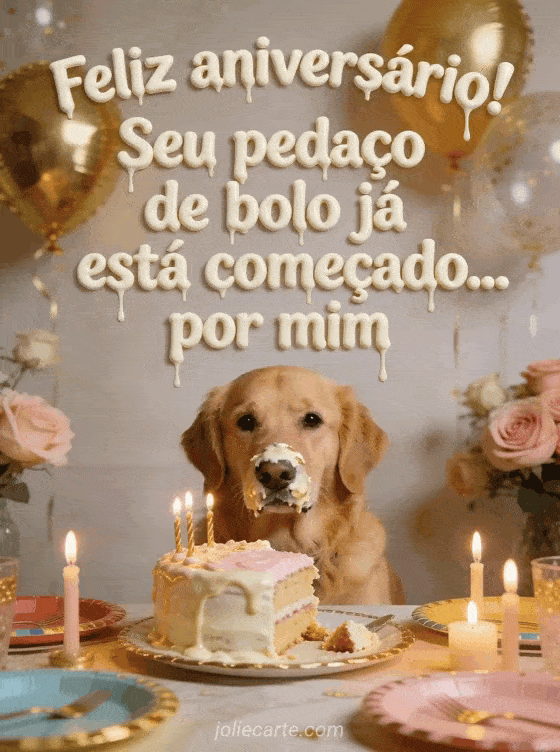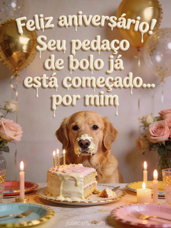 Deixe o aniversário mais leve com um cartão divertido, um golden retriever fotorrealista e um bolo já atacado. Você também pode ver vídeo aniversário engraçado, menino feliz aniversário humor e engraçado feliz aniversário cachorro.