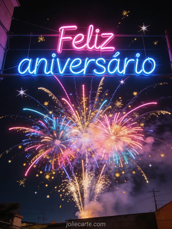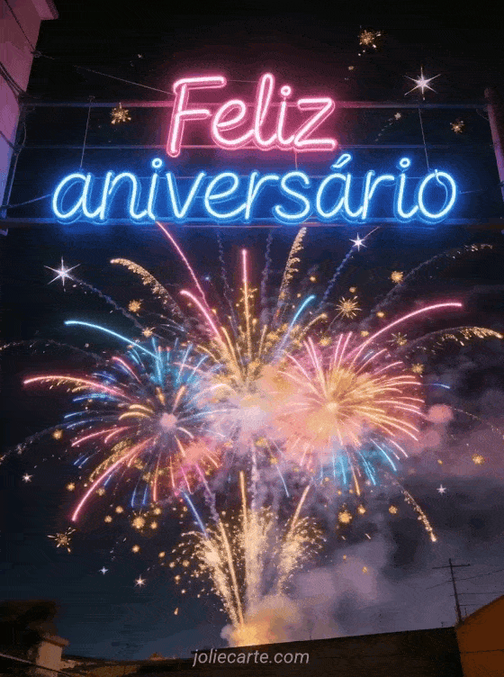 Envie este gif animado espetacular de feliz aniversário com luzes neon e fogos de artifício multicoloridos no céu noturno. Descubra também uma feliz aniversário imagem animada ou um cartão de aniversário gif animado grátis.