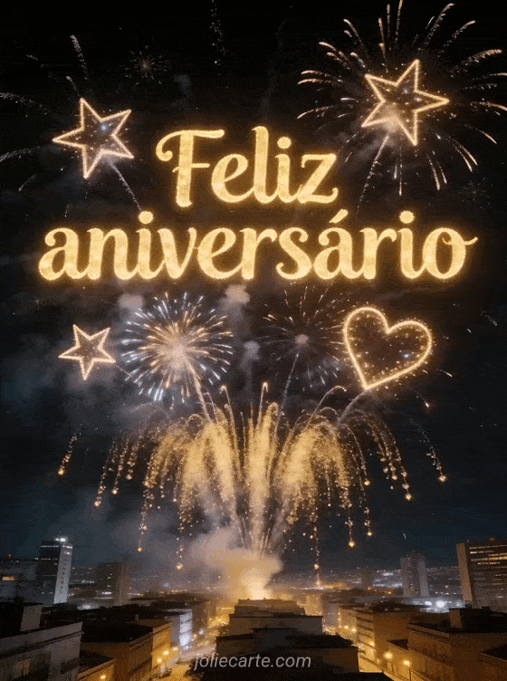 Deslumbre-os com este espetacular gif animado com fogos de artifício dourados explodindo sobre uma cidade iluminada à noite. Descubra também um feliz aniversário gif animado ou uma feliz aniversário imagem animada.