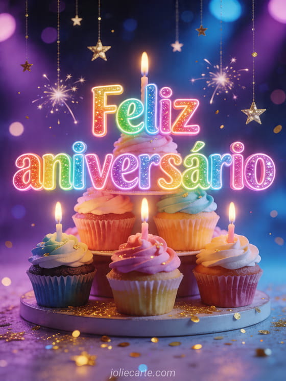 Deixe a celebração mais luminosa com este cartão de aniversário colorido e de conto de fadas cheio de cupcakes e velas. Veja também feliz aniversário rock n roll, feliz aniversário montanha ou feliz aniversário ou feliz aniversário.