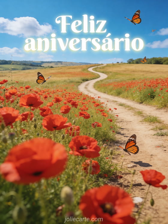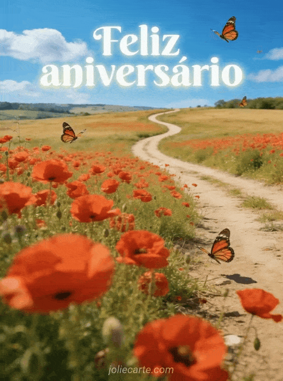 Alegre o dia de alguém com esta impressionante imagem animada com um campo de papoulas vermelhas sob um céu azul com borboletas monarca. Descubra também um cartão de aniversário gif animado grátis ou um feliz aniversário animado buquê de flores.