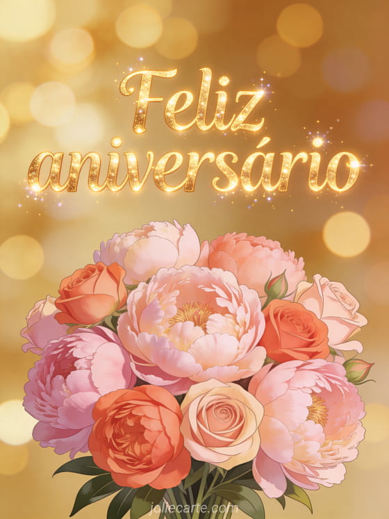 Compartilhe esta imagem de feliz aniversário repleta de flores e luz dourada. Descubra também uma tarjeta palavras de feliz aniversário ou uma tarjeta desejo a você um feliz aniversário cheio de alegria.