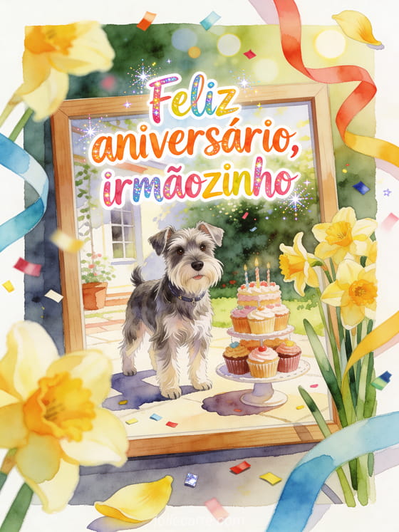 Envie uma mensagem colorida de aniversário para seu irmãozinho com um schnauzer miniatura em um pátio ensolarado, uma torre de cupcakes, narcisos e fitas brilhantes. Veja também feliz aniversário para seu irmão mais velho sms, aniversário irmão gif ou citação aniversário irmão.