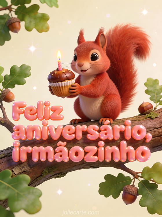 Envie um cartão divertido de aniversário com um esquilo vermelho segurando uma avelã decorada como um mini cupcake, empoleirado em um galho de carvalho. Você também pode compartilhar um aniversário irmãozinho, um aniversário irmão ou um feliz aniversário meu irmão mais velho.
