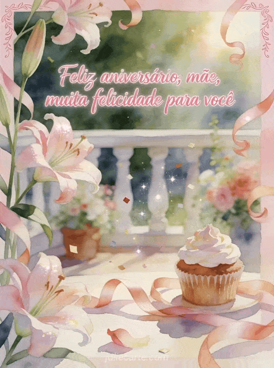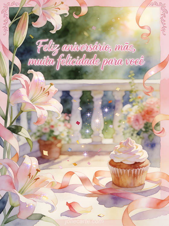 Compartilhe um desejo radiante de aniversário para sua mãe com caligrafia rosa suave, lírios altos, pétalas enroladas, um cupcake confeitado, fitas de seda, confete brilhante e um terraço florido elegante. Você também pode enviar um feliz aniversário mãe gif, um feliz aniversário jovem mãe cartão ou uma feliz aniversário mãe imagem animada.