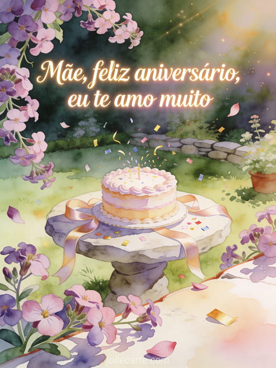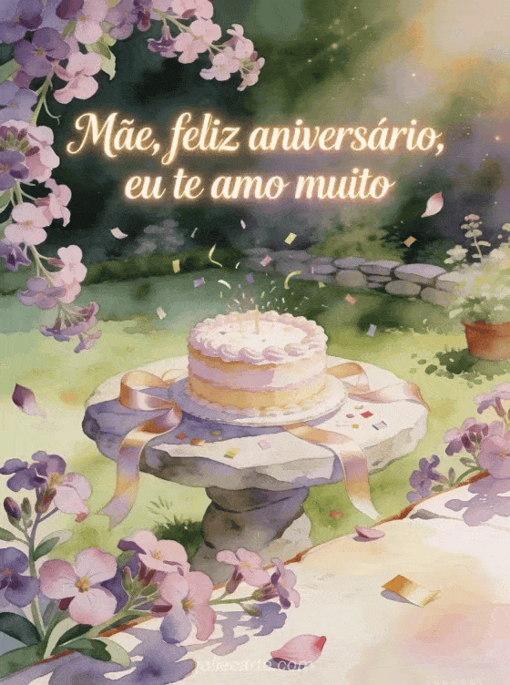 Diga à sua mãe o quanto você a ama com escrita rosa suave, brilho dourado, flores de aubrieta em cascata, um bolo confeitado, fitas de cetim e uma cena festiva em jardim de pedra. Você também pode enviar uma imagem de aniversário para mãe, um feliz aniversário mãe gif animado ou um texto para dizer feliz aniversário à sua mãe.