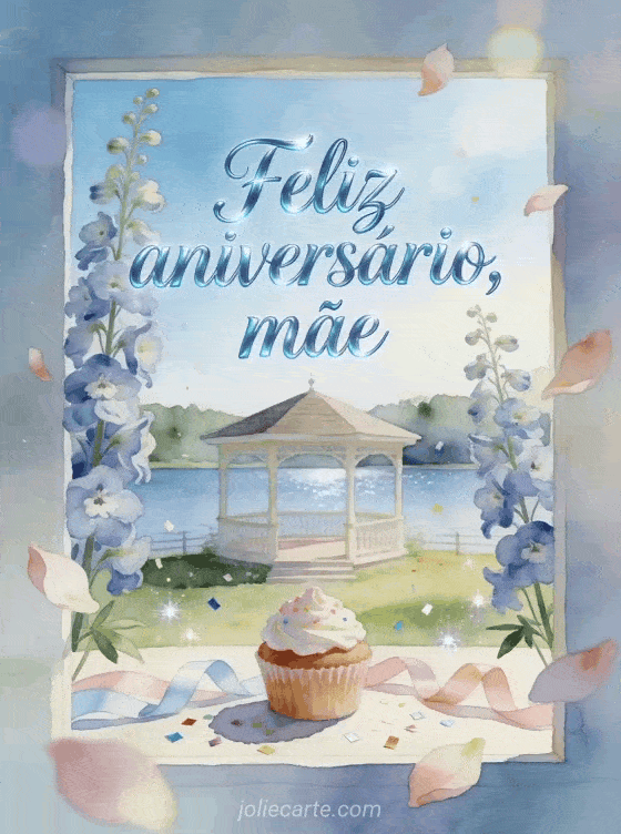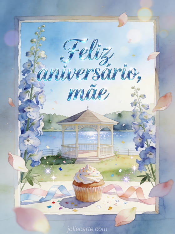 Compartilhe um desejo tranquilo de aniversário para sua mãe com caligrafia azul-céu, delfínios altos, um gazebo à beira do lago, um cupcake confeitado, fitas pastel e confete brilhante. Você também pode enviar um aniversário mãe jovem gif, uma feliz aniversário mãe eu te amo imagem ou uma imagem de aniversário para mãe.