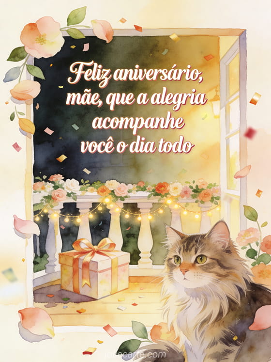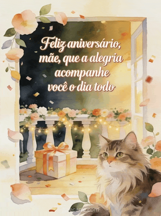 Compartilhe um desejo elegante de aniversário para sua mãe com escrita creme, detalhes em ouro rosé, pétalas, folhas, um gato norueguês, uma caixa de presente com laço e guirlandas luminosas em uma varanda florida. Você também pode enviar um feliz aniversário mãe gif, um aniversário mãe jovem gif ou uma feliz aniversário mãe eu te amo imagem.