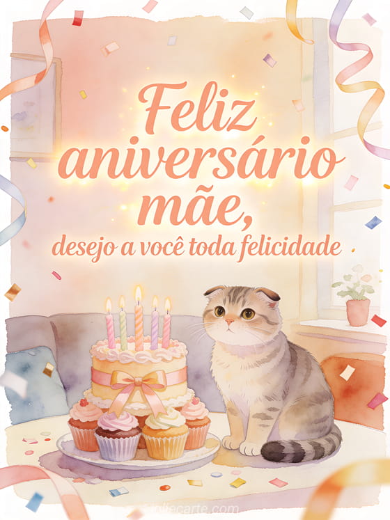 Envie para sua mãe uma mensagem calorosa de aniversário com escrita em tom pêssego, brilho suave e uma cena alegre em aquarela sobre a mesa. Você também pode compartilhar um feliz aniversário sogra texto, um cartão feliz aniversário mamãe grátis ou um feliz aniversário mamãe texto.