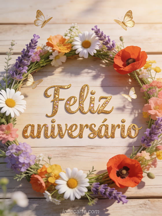 Compartilhe uma mensagem calorosa de aniversário com letras douradas brilhantes, uma coroa colorida de flores silvestres com margaridas, lavanda e papoulas, fundo de madeira clara, luz natural e pequenas borboletas douradas. Você também pode enviar um feliz aniversário cartão para uma jovem mamãe, feliz aniversário mamãe imagens ou um cartão de aniversário mamãe eu te amo.