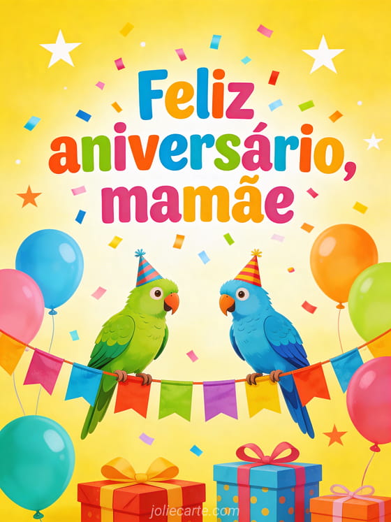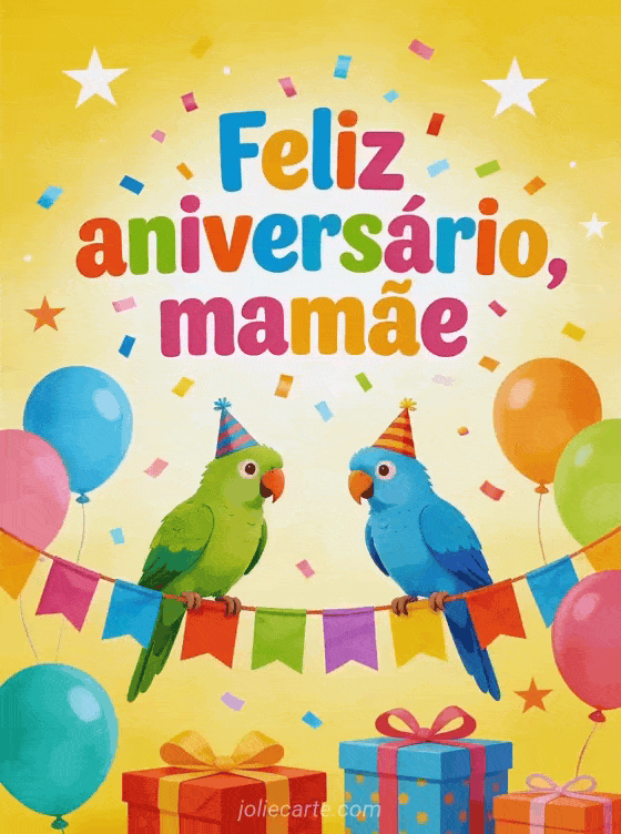 Deseje feliz aniversário à mamãe com um desenho alegre de dois papagaios coloridos em uma guirlanda de bandeirinhas, cercados por presentes, balões, estrelas e um fundo festivo ensolarado. Você também pode enviar um cartão de mensagem curta de aniversário para mamãe, um cartão de cartão de feliz aniversário para mamãe ou um cartão de feliz aniversário mamãe coração.