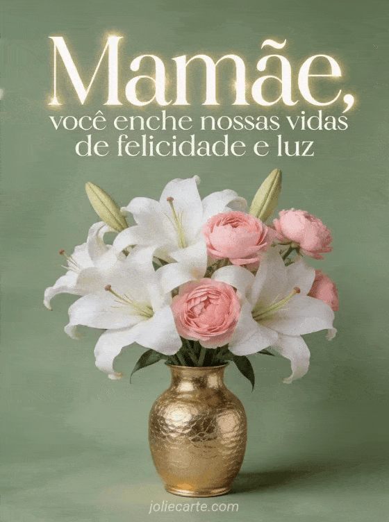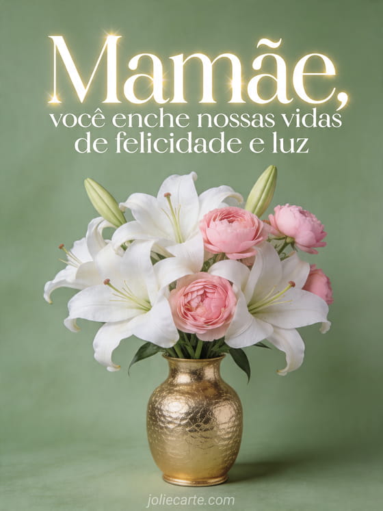 Envie uma carinhosa mensagem de aniversário para sua mamãe com este elegante cartão de lírios brancos e ranúnculos rosados em um vaso dourado sobre um suave fundo verde sálvia. Descubra também cartão feliz aniversário mamãe, mensagem aniversário mamãe e cartão aniversário mamãe.
