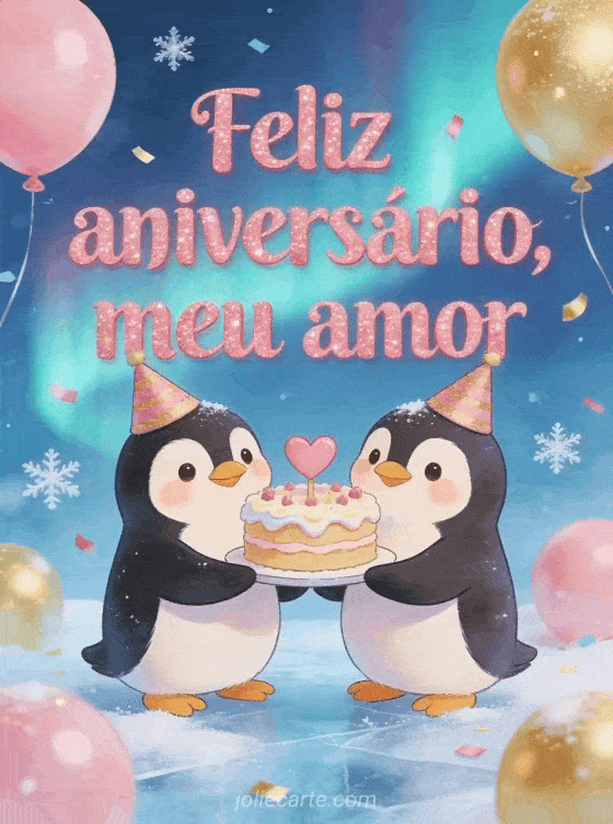 Envie uma mensagem de aniversário fofa e alegre com um adorável casal de pinguins usando chapéus de festa e segurando um bolo com um coração na cobertura. Balões rosados e dourados, confetes, neve brilhante e uma aurora deixam a cena de inverno festiva. Veja também feliz aniversário meu amor homem gif animado, feliz aniversário romântico coração ou feliz aniversário minha querida.