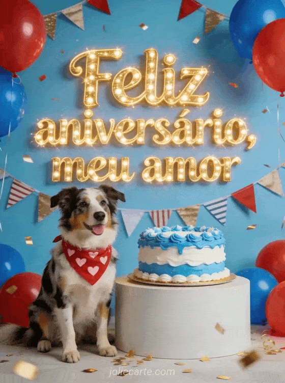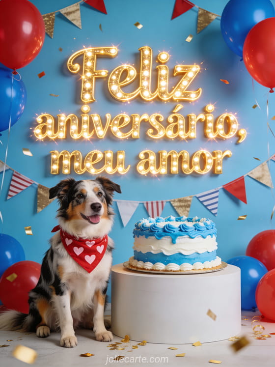 Envie uma mensagem de aniversário alegre com um cão pastor australiano tricolor usando uma bandana vermelha com corações ao lado de um bolo azul e branco. Balões, bandeirinhas e confetes dourados criam uma cena festiva e luminosa. Veja também feliz aniversário romântico coração, feliz aniversário minha querida ou uma feliz aniversário glamour imagem.