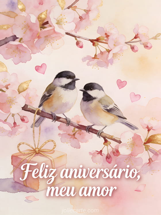 Envie uma mensagem de aniversário romântica com um delicado casal de chapins-azuis em aquarela pousado em um galho de cerejeira em flor. Corações rosados, um laço de presente e tons de primavera deixam este cartão terno e festivo. Veja também uma imagem de aniversário para meu amor, uma imagem de cartão de aniversário romântico ou cartões de aniversário românticos.