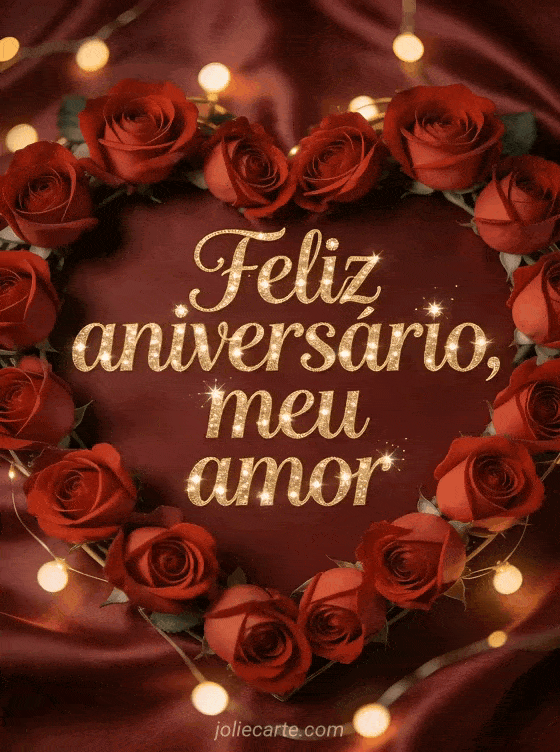 Envie uma mensagem de aniversário apaixonada e romântica com rosas vermelhas fotorrealistas dispostas em forma de coração sobre seda bordô. As luzes quentes ao fundo e as letras douradas criam uma mensagem elegante para seu amor. Veja também feliz aniversário minha querida, feliz aniversário minha querida ou aniversário romântico.