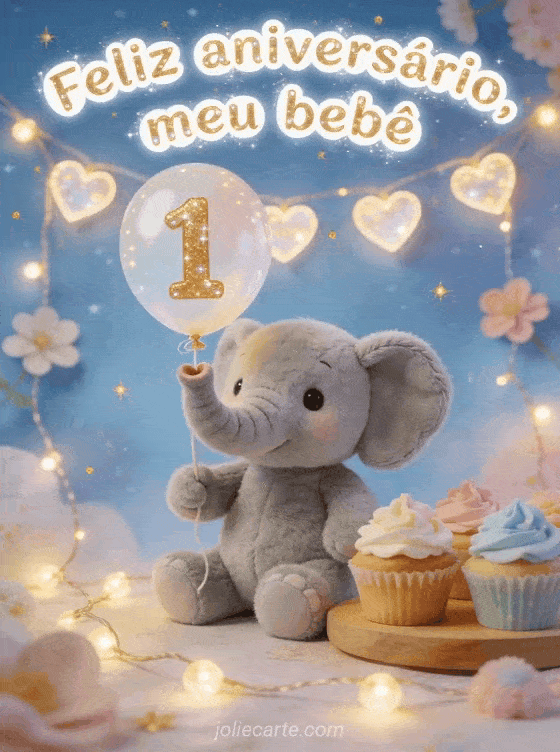 Celebre o primeiro aniversário do seu bebê com uma ilustração suave e mágica de um elefante cinza de pelúcia segurando um balão com o número 1, cupcakes com creme colorido, luzes quentes e um fundo azul pastel estrelado. Veja também feliz aniversário meu bebê pequeno, feliz aniversário filhotes de animais ou texto aniversário bebê menino 1 ano.