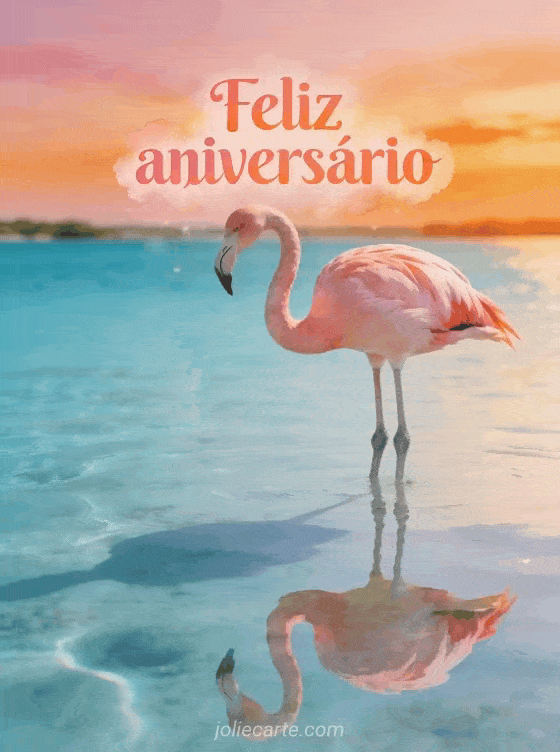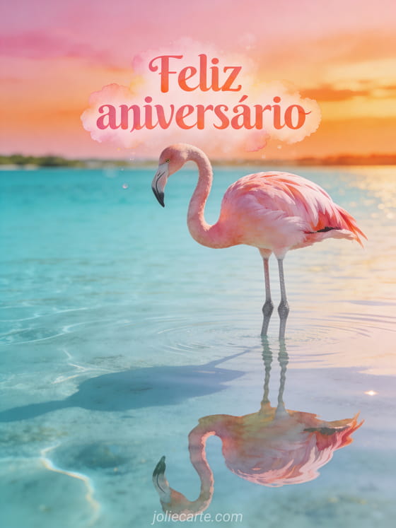 Compartilhe um cartão elegante e fotorrealista de aniversário com um flamingo rosa em pé em uma lagoa turquesa ao pôr do sol, com seu reflexo brilhando na água. Veja também uma mensagem feliz aniversário filho, um feliz aniversário feliz aniversário meu filho ou um sms para desejar feliz aniversário ao meu filho.