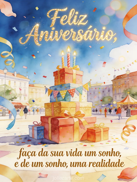 Envie um cartão de aniversário inspirador com uma celebração em aquarela ao redor de uma alta torre de presentes, velas, guirlandas e confetes flutuantes. A mensagem convida seu filho a fazer da vida um sonho e de um sonho uma realidade. Veja também um aniversário para um filho ou um feliz aniversário meu grandão.