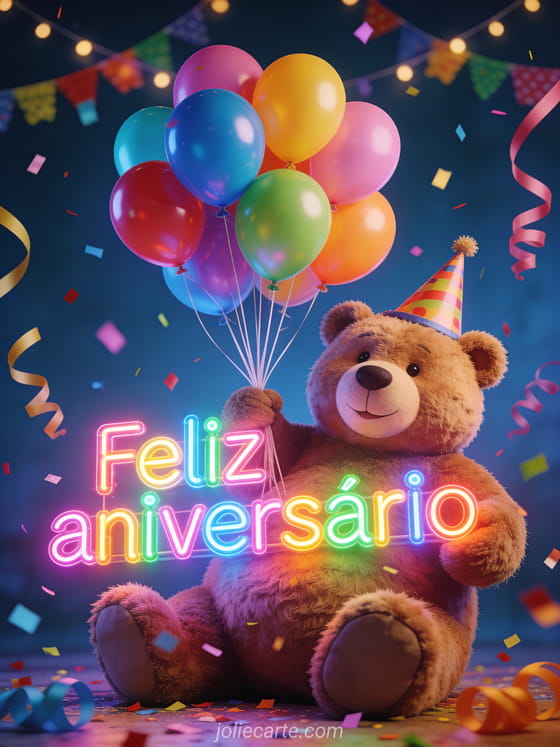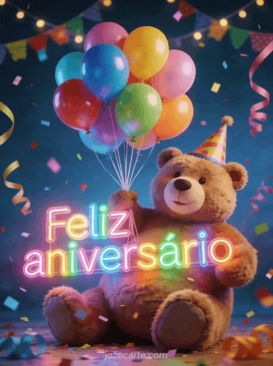 Compartilhe um cartão luminoso de aniversário com um urso de pelúcia gigante usando chapéu de festa e segurando balões coloridos, cercado de confete, serpentinas e guirlandas festivas. Veja também um cartão de aniversário para meu filho, um feliz aniversário filho gif ou um feliz aniversário menino gif.