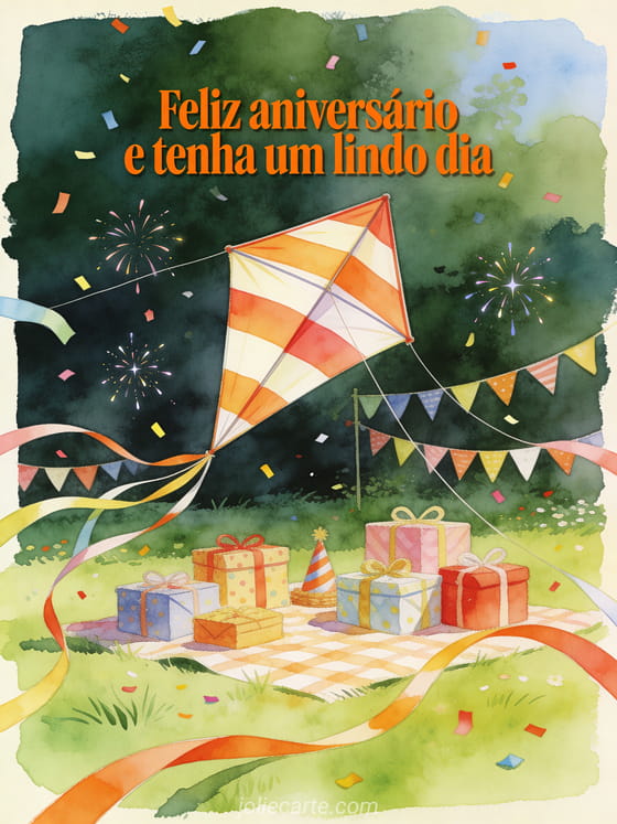 Envie uma mensagem de aniversário cheia de cor com uma cena em aquarela alegre e luminosa. Uma pipa gigante sobe sobre um piquenique na campina com presentes, bandeirinhas e confetes brilhantes para desejar a ele um dia muito lindo.