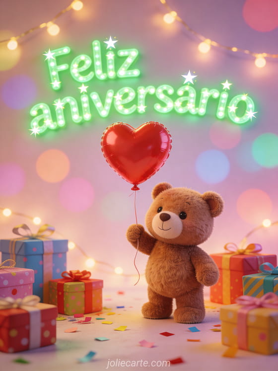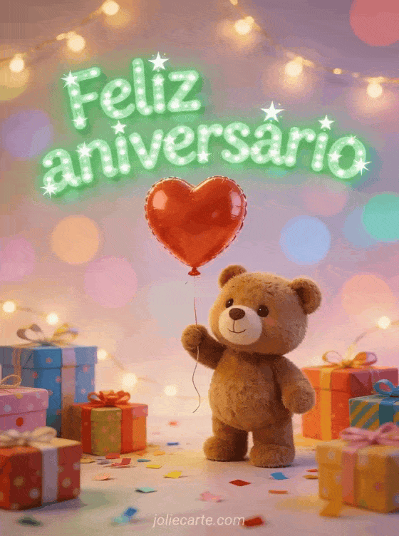 Compartilhe um cartão doce de aniversário com um ursinho marrom pequeno segurando um balão vermelho em forma de coração, cercado por presentes coloridos, confete e luzes em um fundo pastel com bokeh. Você também pode enviar um cartão de aniversário para um irmão, um irmãozinho feliz aniversário meu irmão gif ou um feliz aniversário irmãozinho gif.