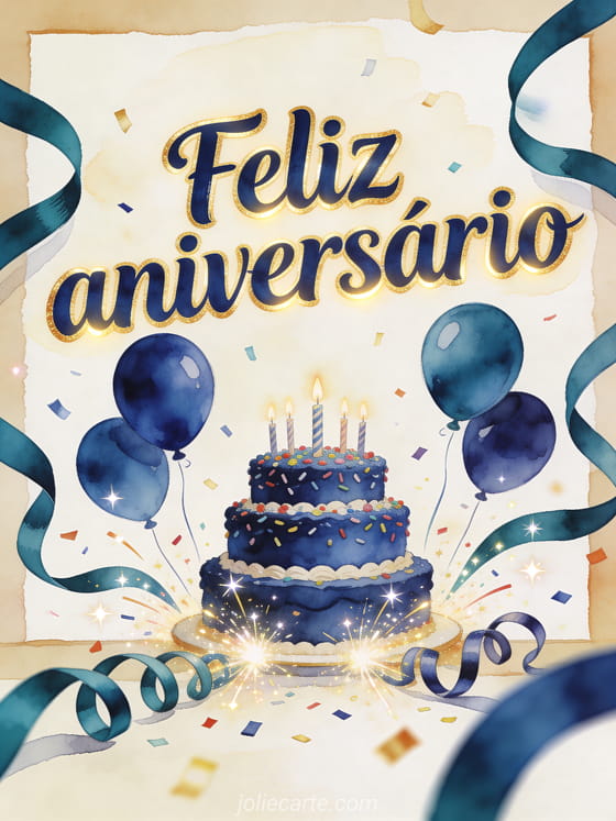 Envie ao seu irmãozinho uma mensagem luminosa de aniversário com um bolo vibrante, balões cobalto e serpentinas verde-petróleo em uma cena festiva de estúdio. Veja também feliz aniversário irmãozinho imagem, aniversário meu irmão ou aniversário irmãozinho.