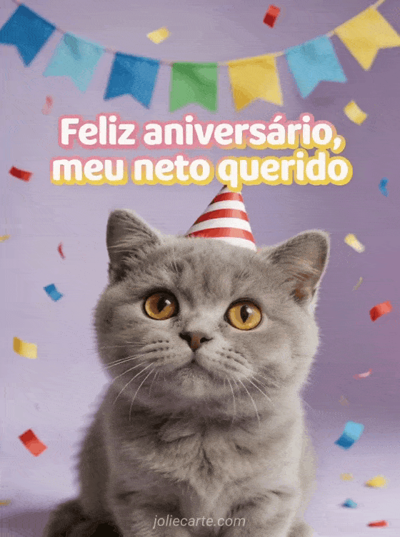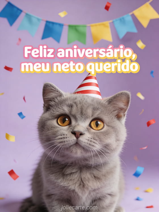 Envie uma mensagem doce de aniversário para seu neto querido com um gatinho british shorthair cinza, um chapéu de festa listrado, bandeirinhas coloridas e confetes caindo. Veja também texto de aniversário para meu neto, votos de aniversário para meu neto ou riso sem alegria.