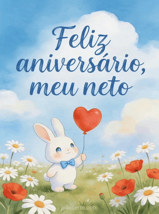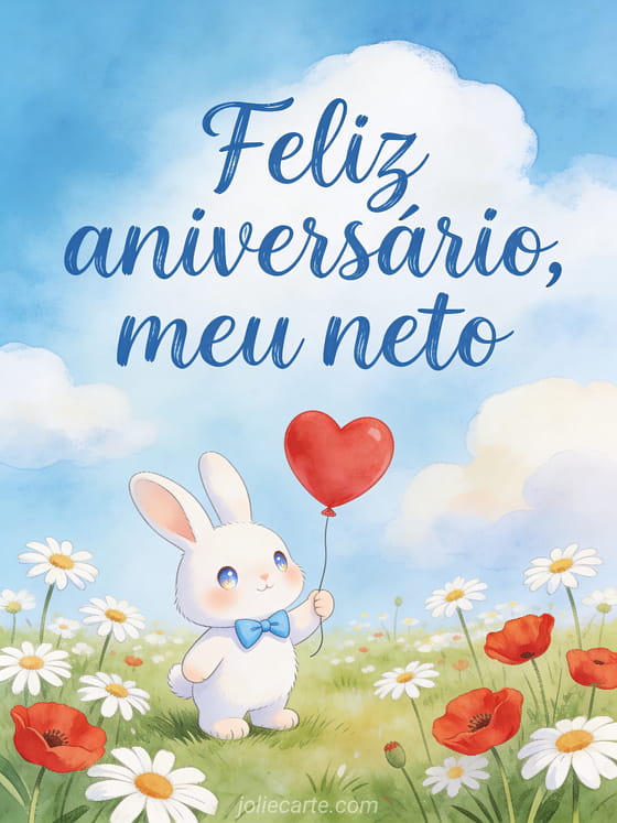 Envie uma mensagem terna de aniversário para seu neto com um coelho branco segurando um balão vermelho em forma de coração em uma pradaria de margaridas e papoulas. Veja também riso sem alegria, mensagem aniversário neto ou feliz aniversário meu neto.