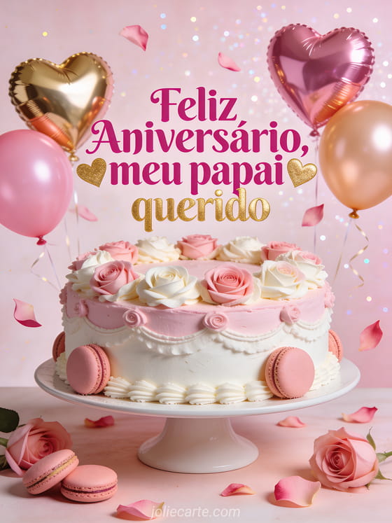 Celebre seu papai querido com um cartão fotorrealista suave que mostra um bolo rosa e branco decorado com rosas de creme, macarons rosa, balões de coração rosa e dourados, pétalas de rosa caindo e um fundo rosa claro brilhante. Veja também feliz aniversário para papai, feliz aniversário meu papai ou feliz aniversário papai amor.