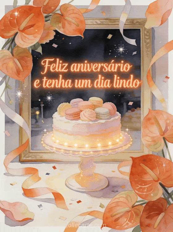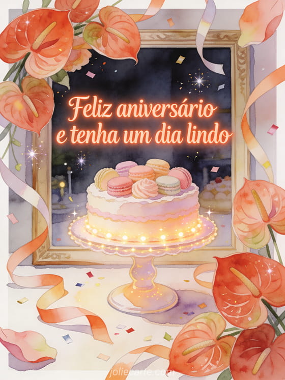 Envie um cartão luminoso de aniversário em aquarela com antúrios, um suporte de bolo iluminado, doces em tons pastel, fitas e confete brilhante. Você também pode compartilhar um feliz aniversário para sua chefe, um mensagem de aniversário colega de trabalho ou um feliz aniversário de uma colega de trabalho.