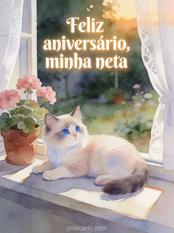 Compartilhe um cartão delicado de aniversário para sua neta com um adorável gato ragdoll de olhos azuis descansando no peitoril da janela ao lado de gerânios rosa e cortinas suaves. Veja também um feliz aniversário para minha neta, outro feliz aniversário para minha neta ou um aniversário para minha neta.