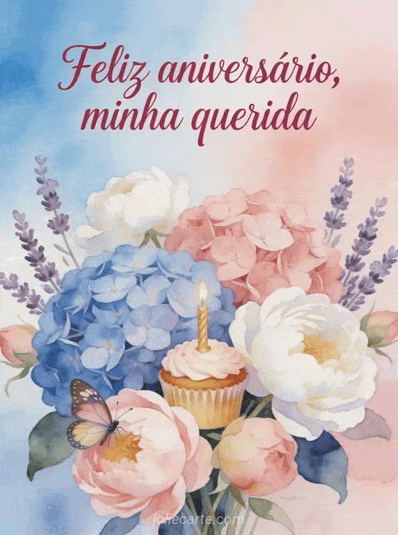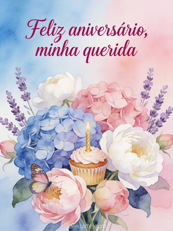 Envie uma mensagem de aniversário terna e romântica com um buquê em aquarela de hortênsias azuis e rosadas, peônias brancas e lavanda. Um pequeno cupcake de aniversário e uma borboleta acrescentam um toque delicado e festivo. Veja também uma feliz aniversário glamour imagem, uma feliz aniversário coração ou uma feliz aniversário meu coração imagem.