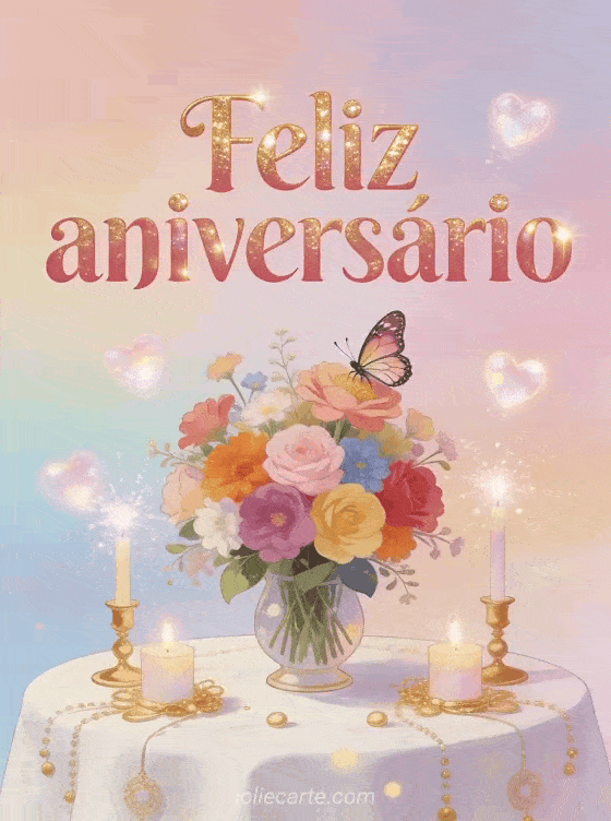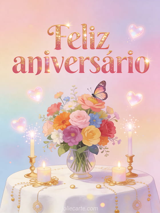 Envie uma mensagem de aniversário romântica com um buquê fotorrealista de flores coloridas, velas brilhantes e corações luminosos. Uma borboleta pousa sobre uma flor ao lado de uma mesa branca festiva com decorações douradas. Veja também feliz aniversário meu amor, feliz aniversário minha querida ou feliz aniversário minha querida.