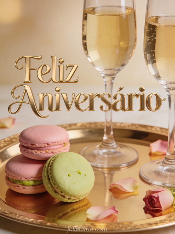 Celebre o aniversário dela com estilo com este elegante cartão que apresenta taças de champanhe de cristal, macarons rosa pastel e pistache em uma bandeja dourada, pétalas de rosa espalhadas e iluminação quente e aconchegante. Descubra também um feliz aniversário mulher ou um peônia cartão aniversário mulher flores.
