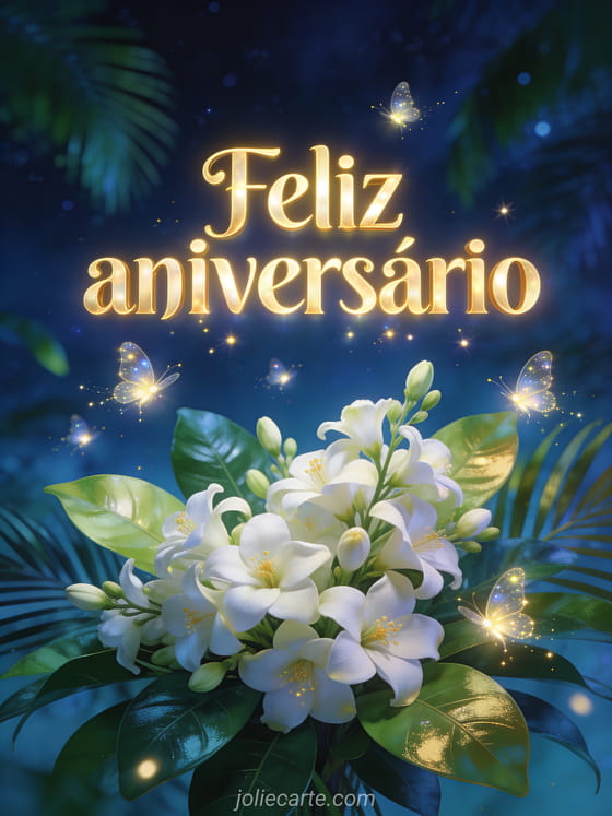 Compartilhe um desejo encantado de aniversário com letras douradas luminosas, vaga-lumes cintilantes, flores brancas de jasmim, folhas tropicais e uma paleta noturna mágica de azul profundo, verde e ouro. Você também pode enviar um cartão de cartão bonito de aniversário mulher grátis gato, um cartão de cartão feliz aniversário mulher grátis ou um cartão de cartão de aniversário mulher gif.