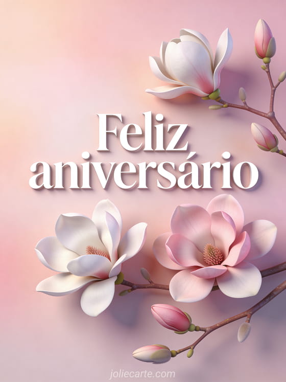 Encante-a com este lindo cartão de aniversário grátis com magnólias brancas e rosas em ramos delicados. Descubra também um cartão aniversário amiga mulher ou um feliz aniversário mulher com gato.