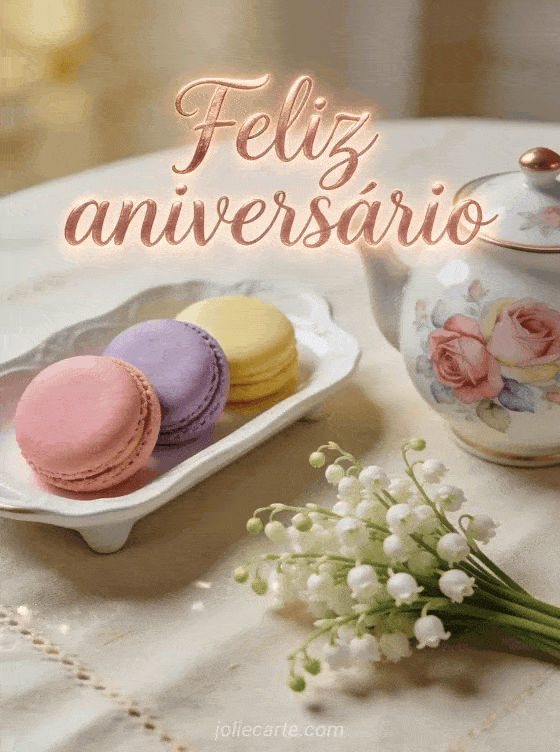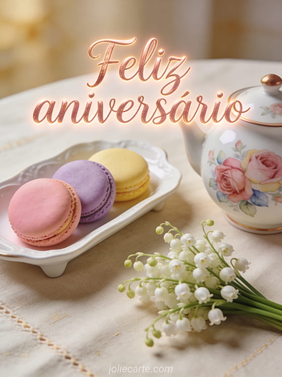 Compartilhe este cartão fotorrealista com macarons coloridos, bule floral e lírio-do-vale para uma celebração refinada. Você também pode ver dromedário cartão aniversário mulher, amiga aniversário mulher amiga e gif feliz aniversário mulher humor.
