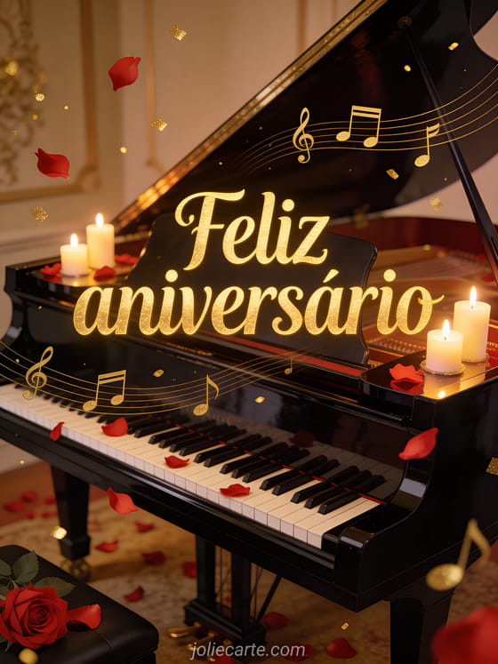 Comemore com um cartão de aniversário refinado com piano de cauda brilhante, velas acesas, pétalas de rosa e luz acolhedora. Você também pode ver feliz aniversário imagens, feliz aniversário gato e cartão virtual feliz aniversário sapo.