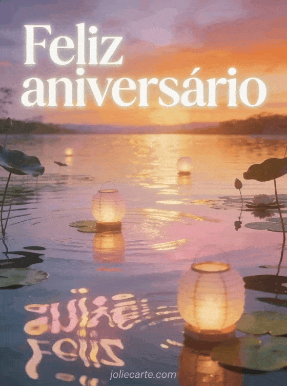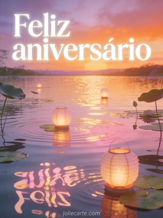 Ofereça um momento de calma com este lago fotorrealista ao pôr do sol, lanternas flutuantes brilhantes e reflexos dourados. Você também pode ver feliz aniversário gato imagem, feliz aniversário com gato ruivo e aniversario grupo.