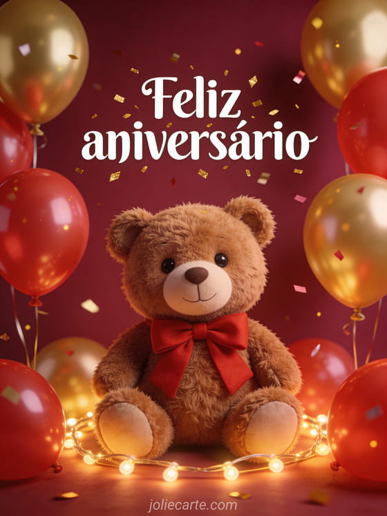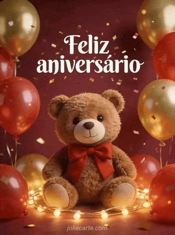 Envie uma mensagem calorosa e festiva de feliz aniversário para sua neta com um pequeno urso de pelúcia marrom usando um grande laço vermelho, rodeado por balões vermelhos e dourados, luzes de fada e confete dourado. Veja também gif aniversário neta grátis ou cartão aniversário neta.